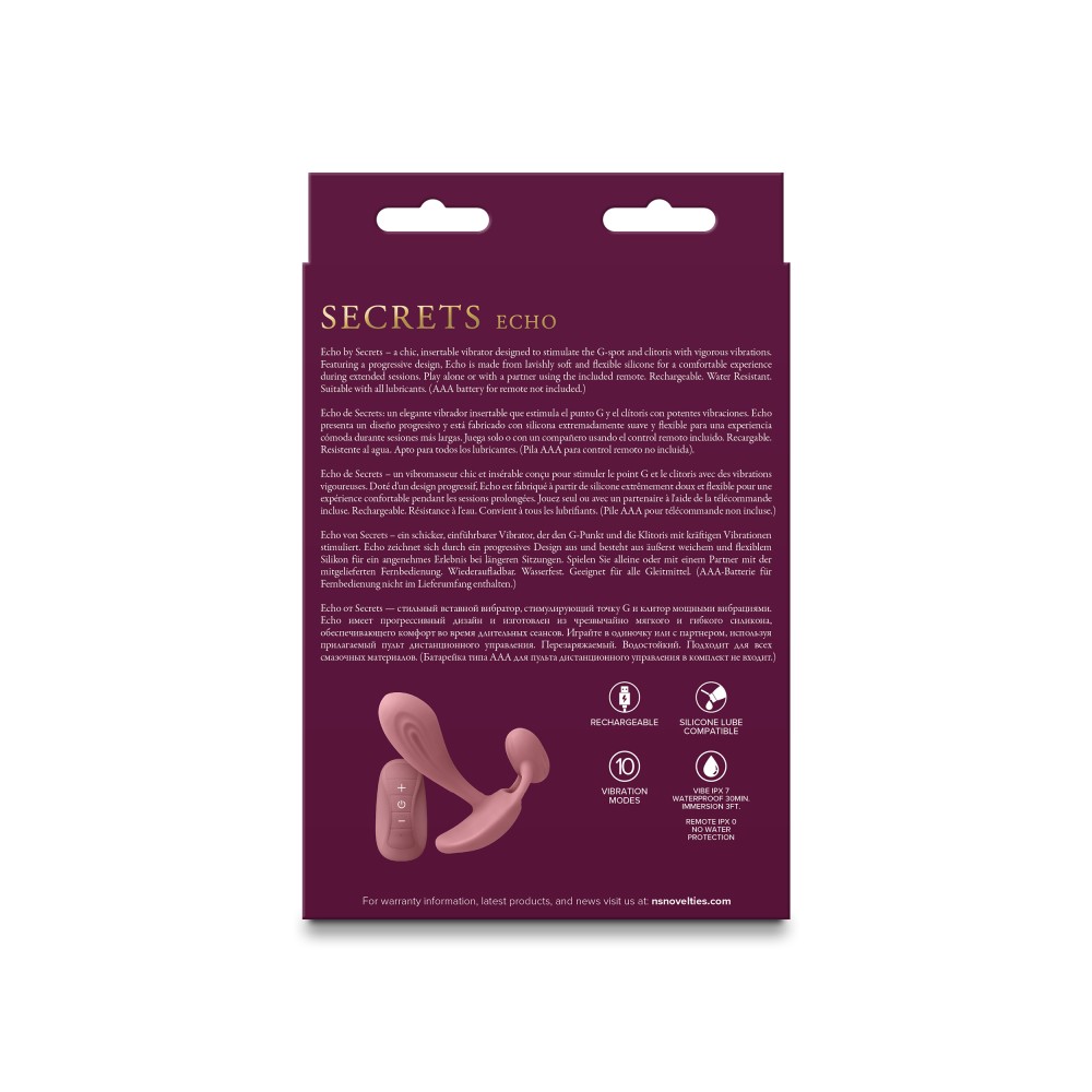 Ez a vibrátor tökéletes választás azoknak, akik szeretnék egyszerre élvezni a G-pontos és csiklóizgatást, modern, kézre álló és csendes készülékben. A Secrets Echo a diszkrét luxus és a maximális élvezet tökéletes kombinációja.